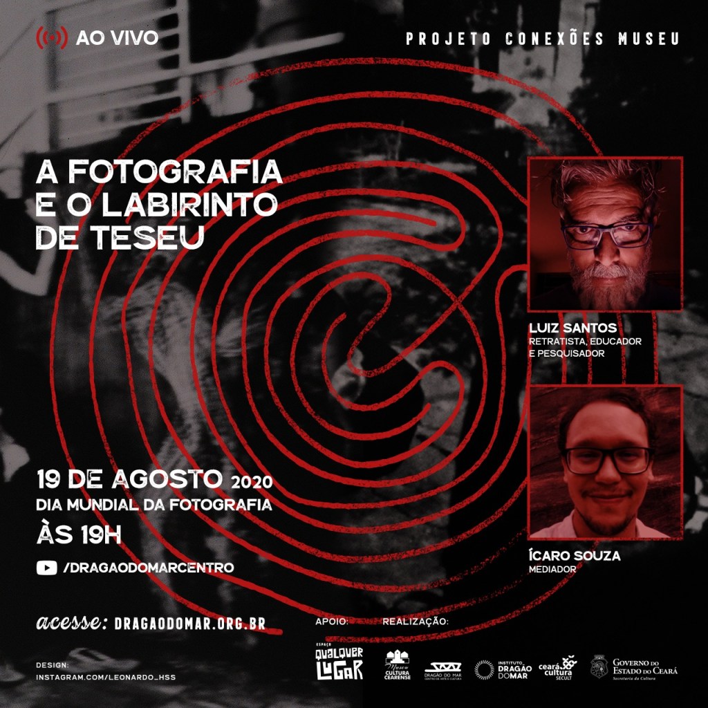 Em alusão ao Dia Mundial da Fotografia, celebrado no dia 19 de agosto, o Centro Dragão do Mar de Arte e Cultura, por meio do Museu da Cultura Cearense (MCC), convidou o fotógrafo, retratista, educador e artista visual Luiz Santos para abrir seu estúdio e apresentar o processo de desenvolvimento do trabalho autoral que vem ao longo do período de isolamento social. Numa conversa ao vivo, no canal do Dragão do Mar (www.youtube.com/dragaodomarcentro), nesta quarta-feira (19), às 19h, o multiartista falará sobre “A Fotografia e o Labirinto de Teseu”. A partir do mito grego de Teseu, o convidado falará sobre os caminhos da fotografia, desde o lambe-lambe à fotografia de smartphone, entre o retrato-imagem e o retrato-escuta, entre o retrato-pensamento e o retrato-corpo. Quem recebe o convidado para o bate-papo é Ícaro Souza, coordenador do Núcleo Educativo do MCC.