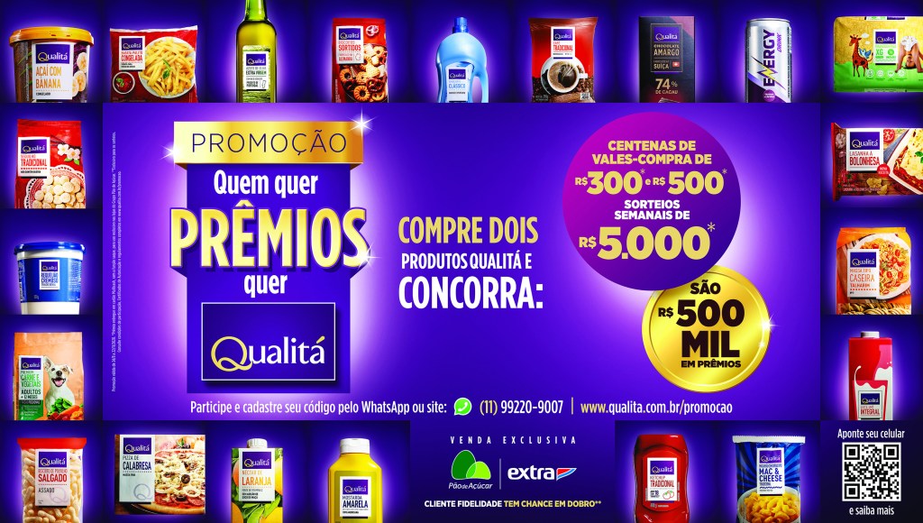 Qualitá, marca exclusiva das redes Extra e Pão de Açúcar, lança em 24 de agosto uma campanha promocional inédita: Quem quer prêmios quer Qualitá. A partir dessa data, na compra de dois produtos dos mais de 2 mil itens do portfólio da marca, o cliente ganha um número da sorte para concorrer a R$ 500 mil em prêmios. São centenas de vales-compra de R$ 300 e R$ 500, além de um sorteio especial por semana, no valor de R$ 5 mil.