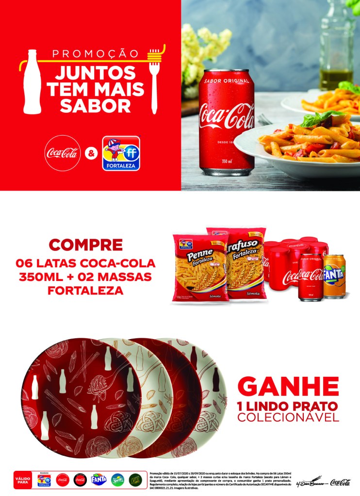 Duas gigantes do mercado de alimentos e bebidas unem-se para oferecer uma experiência especial aos consumidores e o resultado não poderia ser melhor. A M. Dias Branco, a partir das marcas Fortaleza e Vitarella, líder em massas e biscoitos no Brasil, e a Solar Coca-Cola, segunda maior fabricante do sistema Coca-Cola no Brasil, promovem a ação de compre e ganhe “Juntos tem mais sabor”, em que na compra de produtos das marcas, o consumidor levará para casa um prato colecionável de porcelana. A ação ocorrerá até o fim do mês de setembro nos supermercados do Nordeste.