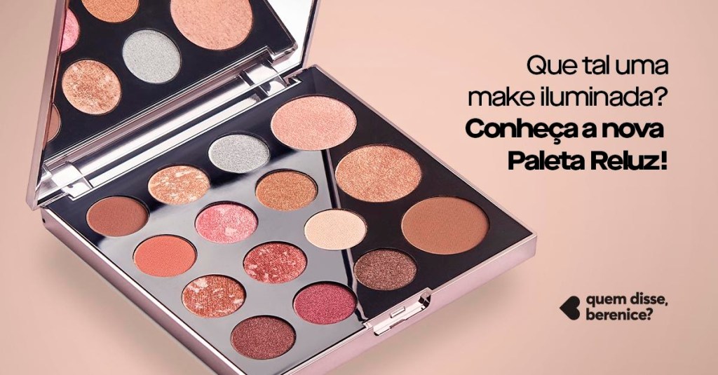 Pronta para celebrar a liberdade da beleza feminina, Quem Disse, Berenice? traz a essência festiva do final do ano para o universo da maquiagem em sua primeira paleta multifuncional metálica: Reluz (R$99,00, 15g), com cores e texturas que podem ser usadas em todo o rosto — como sombra, iluminador, blush ou bronzer, combinadas de forma intensa para um verão inteiro livre para brilhar!