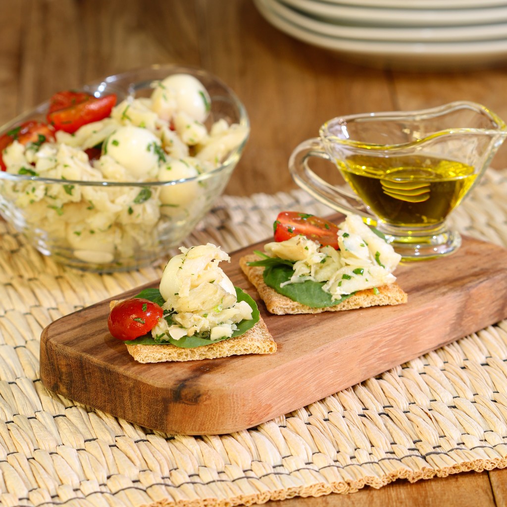 3) Decore cada Magic Toast Marilan com o agrião e adicione o bacalhau por cima. Sirva em seguida.