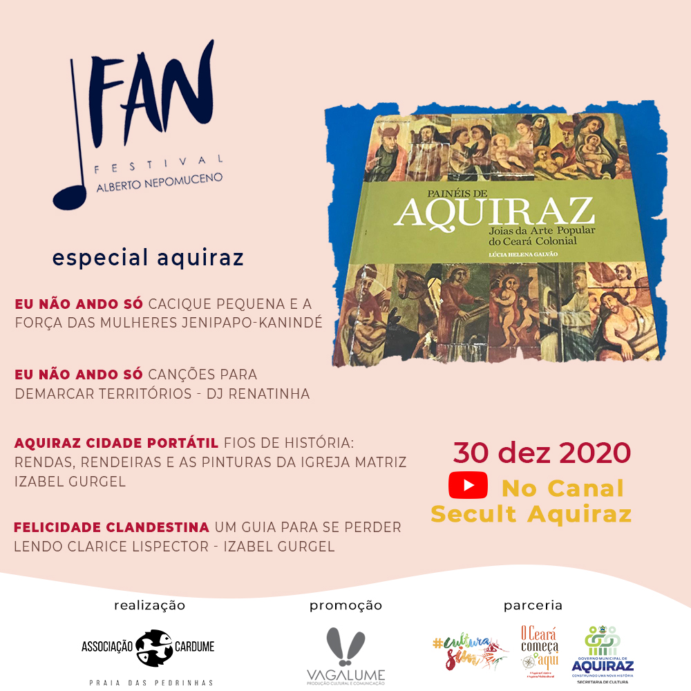 Já disponibilizados no canal Youtube da Secult Aquiraz (https://www.youtube.com/secultaquiraz ), o FAN Aquiraz traz o seguinte quarteto de vídeos: