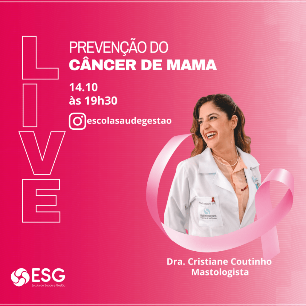 A campanha Outubro Rosa dá visibilidade e estimula a conscientização sobre a importância dos cuidados com a saúde durante todo o ano e incentiva mulheres a realizar exames preventivos e a agendar consulta com um especialista pelo menos uma vez por ano, além de fomentar a adoção de hábitos de vida mais saudáveis. Diante disso, a Escola de Saúde e Gestão (ESG), irá promover a live “Prevenção do Câncer de Mama”, no dia 14 de outubro (quinta-feira), a partir das 19:30, pelo instagram @escolasaudegestao . A responsável por esclarecer as dúvidas na live será a mastologista Cristiane Coutinho.