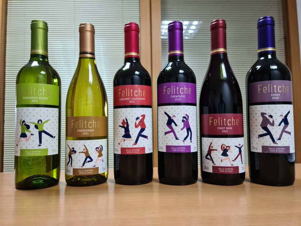O Sauvignon Blanc, de cor amarelo-palha e aromas muito expressivos de limão e maracujá, muito refrescante em boca e com acidez marcante, tem na nova garrafa duas mulheres dançando. Já o Felitche Syrah, traz dois rapazes dançando que remetem ao caráter vivaz desse vinho. Com olfato de frutas vermelhas maduras, como framboesas combinadas a morangos e cerejas, é também frutado em boca com equilíbrio e maciez, combinando bem a boa acidez, taninos suaves e agradável final em boca.