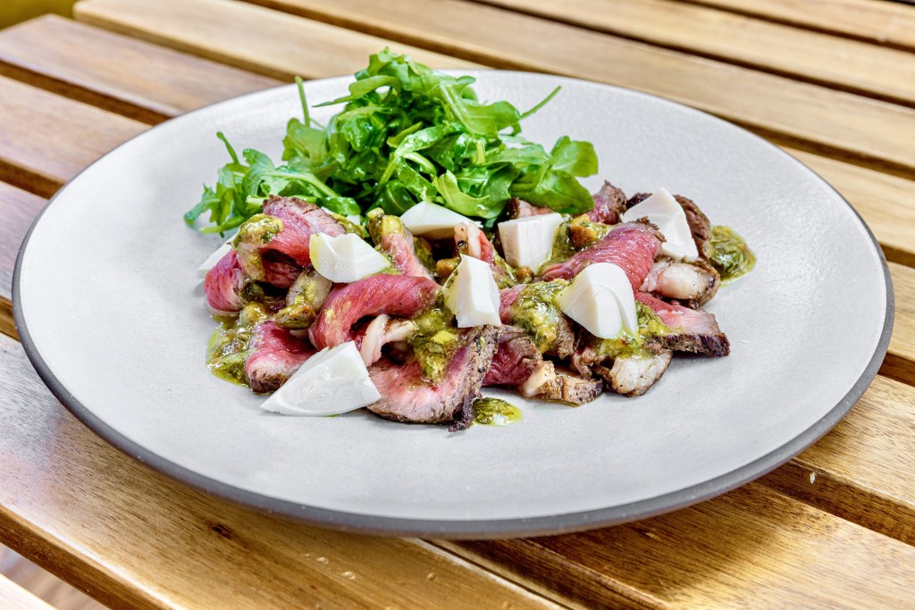 Para a montagem do prato, com uma faca bem afiada, fatiar finamente a picanha a ponto de sozinha se dobrar. Em um prato dispor as fatias de modo natural para que ganhe movimento e se observe o ponto e a crosta formada.