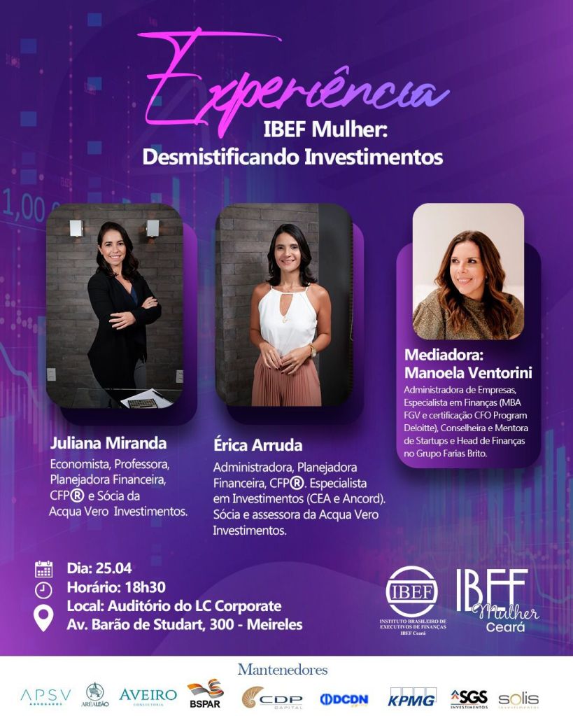 No próximo dia 25 de abril, o IBEF Mulher Ceará irá realizar um bate-papo exclusivo para associados abordando a temática “Experiência IBEF Mulher: Desmistificando Investimentos”. O objetivo do evento é fornecer informações seguras e quebrar tabus criados pelos investidores, para que todos possam investir com confiança e conhecimento.