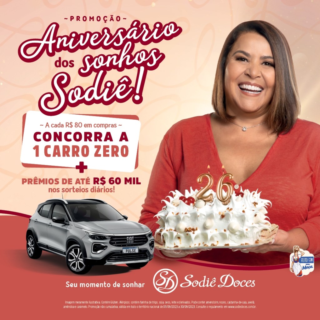 Para comemorar essa data, de 1º a 30 de setembro, acontece a promoção ‘Aniversário dos Sonhos Sodiê’. São 60 mil reais distribuídos em 20 vouchers diários de 100 reais e o grande prêmio final, um Pulse zero quilômetro.