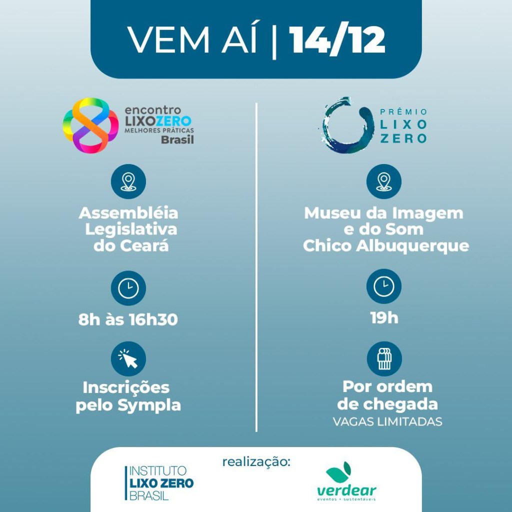 No dia 14 de dezembro será realizado o Prêmio Lixo Zero, evento que fomenta a sustentabilidade e promove o uso consciente de resíduos. O acontecimento será iniciado com o Encontro Melhores Práticas Lixo Zero Brasil, no auditório da Assembléia Legislativa do Ceará (ALECE) das 8 às 17h, onde os participantes poderão ser inspirados e conhecer de perto os premiados nas 23 categorias que impulsionaram o conceito lixo zero no Brasil durante o ano, dando seguimento para o Prêmio Lixo Zero às 19h no Museu de Imagem e do Som, na sala imersiva em um festival de Gala. O Evento será gratuito por ordem de chegada, com vagas limitadas. Serão premiados aqueles que contribuem com o projeto, tem impacto positivo na economia e ousa na criatividade e principalmente, no desenvolvimento sustentável.
