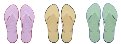 A Havaianas Slim Point tem bordas e laterais em cores que contrastam com os tons pastéis da sola e das tiras finas com logo metálico, criando um efeito moderno e colorido. Suas combinações de cores são a Azul Provence (mix de azul e verde-claro), a Amaranto (mix de lilás e vinho) e o Verde Pantanal (mix de areia e verde-escuro), ideais para quem não dispensa o estilo e a atitude brasileira.