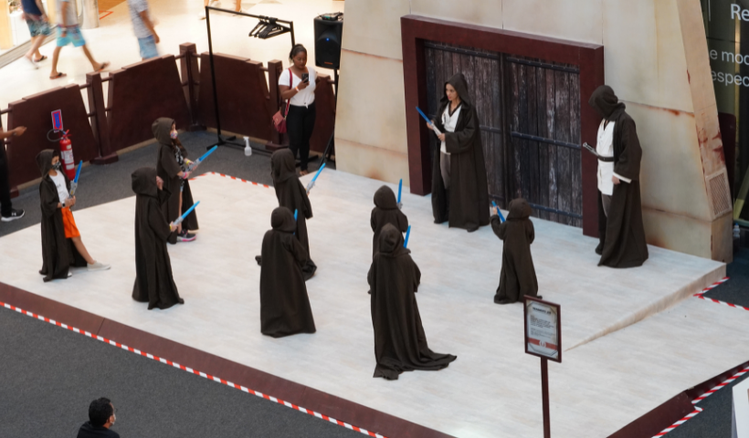 A atração conta com labirinto vertical com desafios, estação de game com realidade virtual, oficinas de jogos até o encontro com o boneco Grogu, em 3D. Após encontrar o personagem, o participante precisa acionar o botão para finalizar a atividade. Ao fim de todas as brincadeiras, é hora de os guerreiros iniciarem o treinamento Jedi para combater as forças do mal. Os participantes transformam-se em um Padawan, para aprender com o mestre Jedi alguns golpes de sabre de luz.