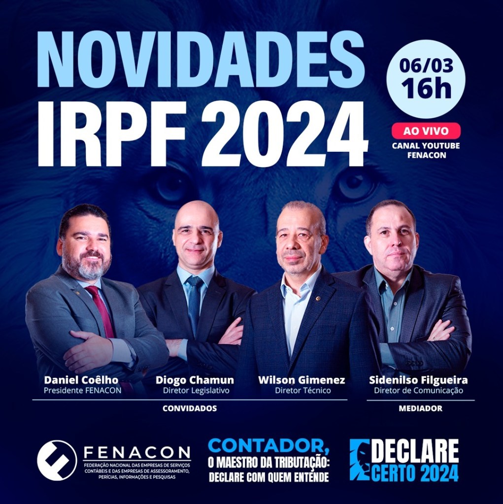 Nesta quarta-feira (6) às 16h você poderá sanar todas as dúvidas acerca das novidades do Imposto de Renda 2024. A FENACON realizará uma live a fim de repercutir e esclarecer as atualizações apresentadas pela Receita Federal.