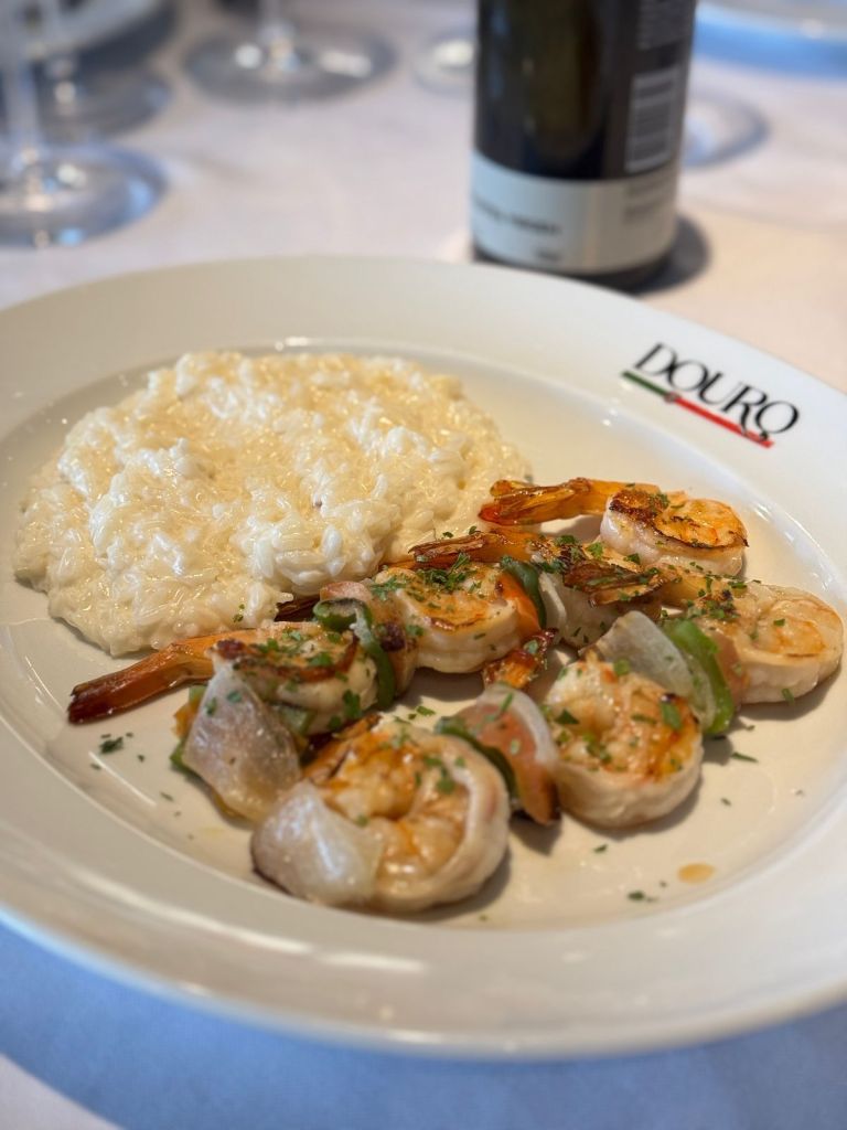 No menu principal, o Douro Restaurante oferece opções para todos os gostos. O Atum do Dia com Legumes, com atum grelhado e acompanhamentos como batatas, aspargos, brócolis, tomate, cenoura, cogumelos e pimenta biquinho, é uma escolha leve e saborosa. Já os amantes de camarão podem se deliciar com o Brochete de Camarões, uma espetada servida com arroz e limão siciliano. Outra estrela do menu é o Bacalhau Gratinado, um lombo de bacalhau gratinado com cebola, brócolis e purê, ou o Bacalhau Superior, que combina bacalhau grelhado com camarões, batatas, ovos, alho, azeitonas pretas e salsinha. Para os apreciadores de carnes, o Medalhão do Chefe, composto por medalhão de filé grelhado com arroz piamontese, molho madeira, bacon e champignon, é uma opção imperdível.