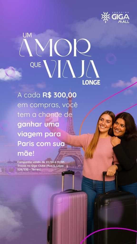 No mês do Dia das Mães, o Shopping Giga Mall apresenta a campanha “Um Amor que Viaja Longe”, que vai sortear uma viagem internacional inesquecível para Paris — a charmosa e encantadora cidade luz. A viagem é destinada a mãe e filho(a), uma oportunidade única de viver momentos especiais juntos e eternizar memórias que ficarão para sempre no coração.