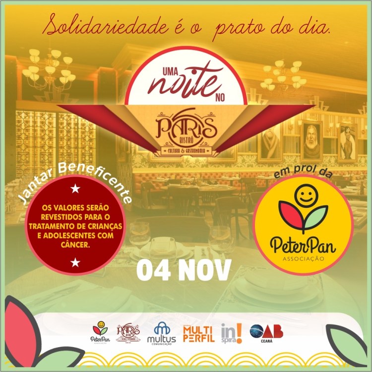 A Associação Peter Pan, em parceria com o restaurante Paris 6 Fortaleza, está promovendo um jantar beneficente no próximo dia 04 de novembro (segunda-feira), às 20h, na unidade do bistrô cultural localizada no piso E1 do Shopping RioMar Fortaleza (Rua Desembargador Lauro Nogueira, 1500 – Papicu).