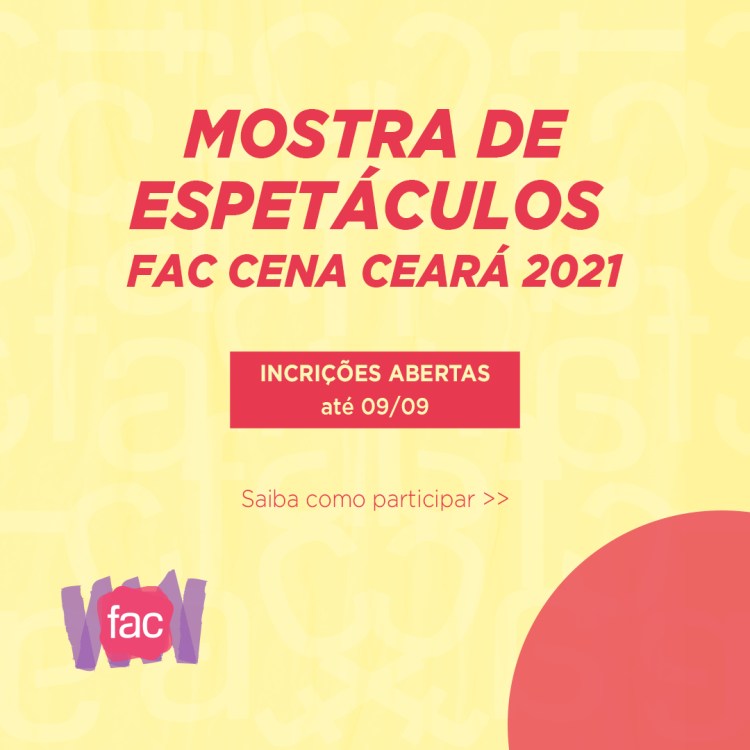 Artistas, grupos e coletivos das Artes Cênicas do Ceará podem inscrever projetos para a Mostra de Espetáculos do FAC Cena Ceará até o dia 09 de setembro (quinta-feira). A convocatória de seleção é exclusiva para artistas do Ceará. O regulamento com informações sobre cachê e tempo de exibição do trabalho está disponível no link das […]