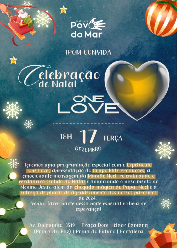 O clima mágico do Natal está de volta, e o Instituto Povo do Mar (IPOM) convida a comunidade para um momento de celebração e alegria. No próximo dia 17 de dezembro, a festa One Love promete emocionar o público, com duas lindas apresentações das crianças que fazem parte do IPOM. A celebração contará ainda com […]